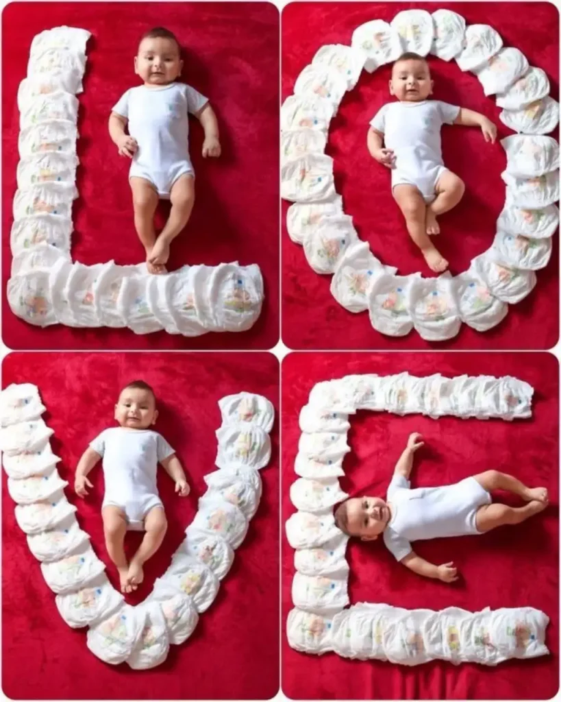 This adorable idea is all about simplicity. Spell out “LOVE” using your baby’s diapers for a fun, creative Valentine’s photo that’s easy to do at home.