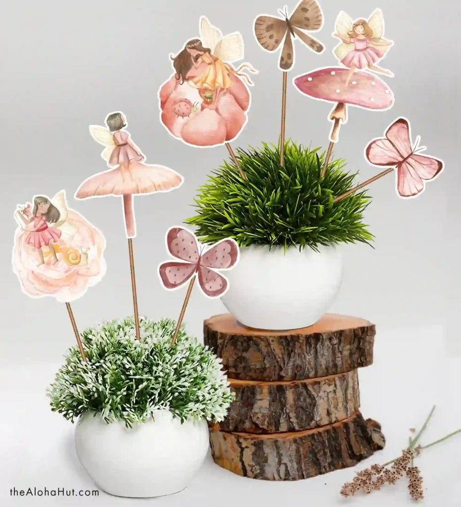 For tables, try using slices of wood, pots of flowers, or printable fairy centerpieces for a quick and lovely setup. These details will make your space look like a tiny enchanted forest.