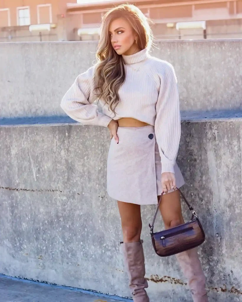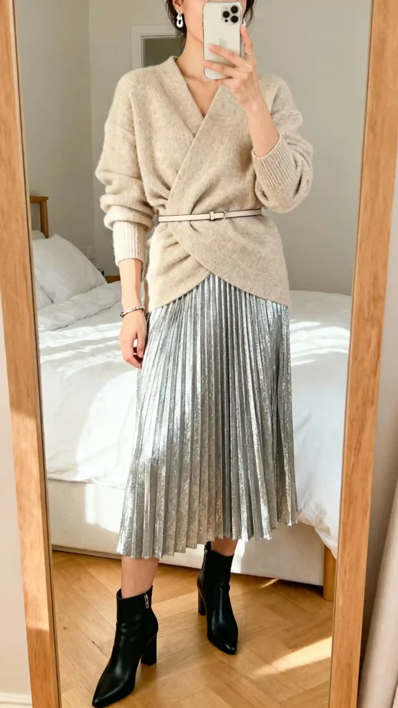 A pleated midi skirt paired with a wrap sweater creates a flattering and graceful winter look. The soft folds of the skirt add movement, while the sweater keeps you cozy and shaped. Choose subtle tones like champagne, mauve, or soft gray, and complete the outfit with ankle boots or classic pumps. Add a thin belt to highlight your waist and a small structured bag for a polished touch.