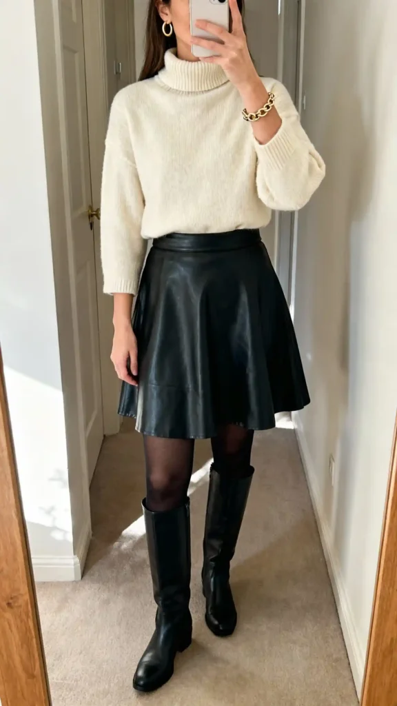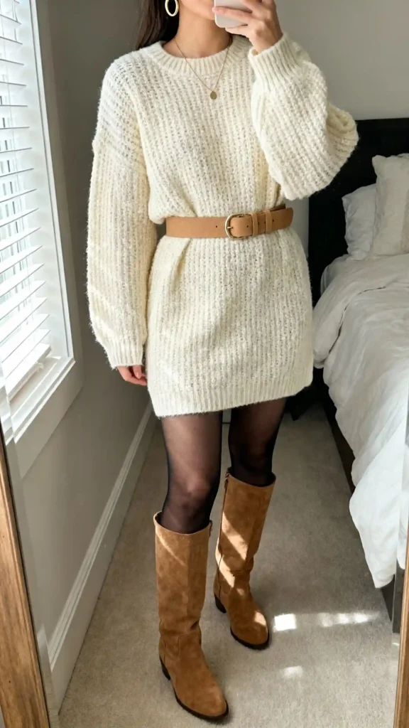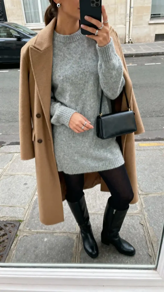 A sweater dress with tall boots is a timeless winter look that always feels put together. The soft knit keeps you warm while the boots add a sleek touch that photographs beautifully. Choose soft tones like cream, gray, or blush and finish with simple gold jewelry. Add a waist belt if you want to shape your silhouette and layer with tights when it’s extra chilly.
