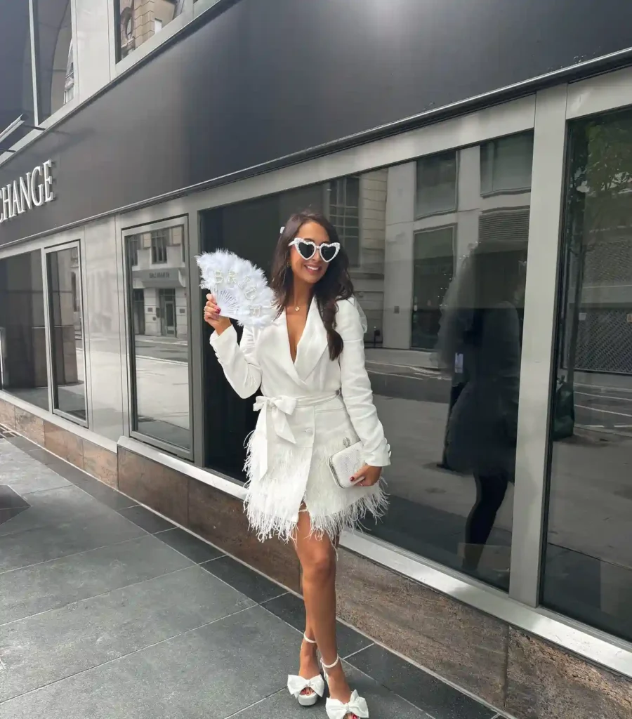 This white blazer dress is such a classic and elegant choice. It stands out beautifully and adds a touch of sophistication that makes it perfect for a winter baby shower.