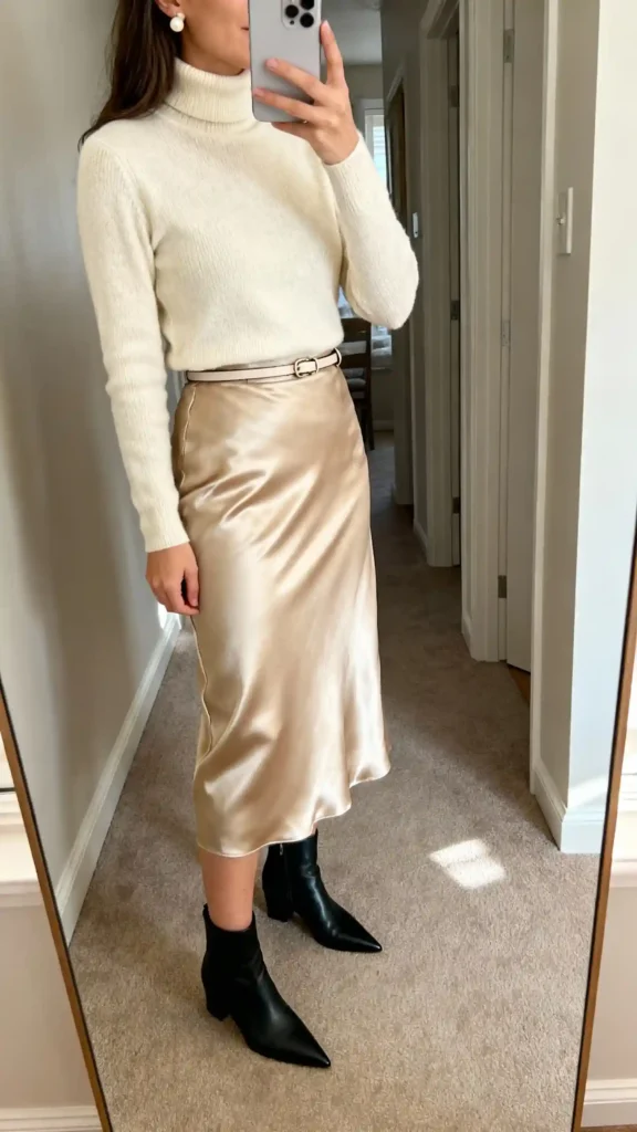 Mixing a satin midi skirt with a cozy cashmere turtleneck is the perfect balance of elegance and comfort. The shimmer of the satin pairs beautifully with the soft texture of the sweater. Choose warm tones like champagne or rose for a feminine touch and complete the look with ankle boots or heels.
