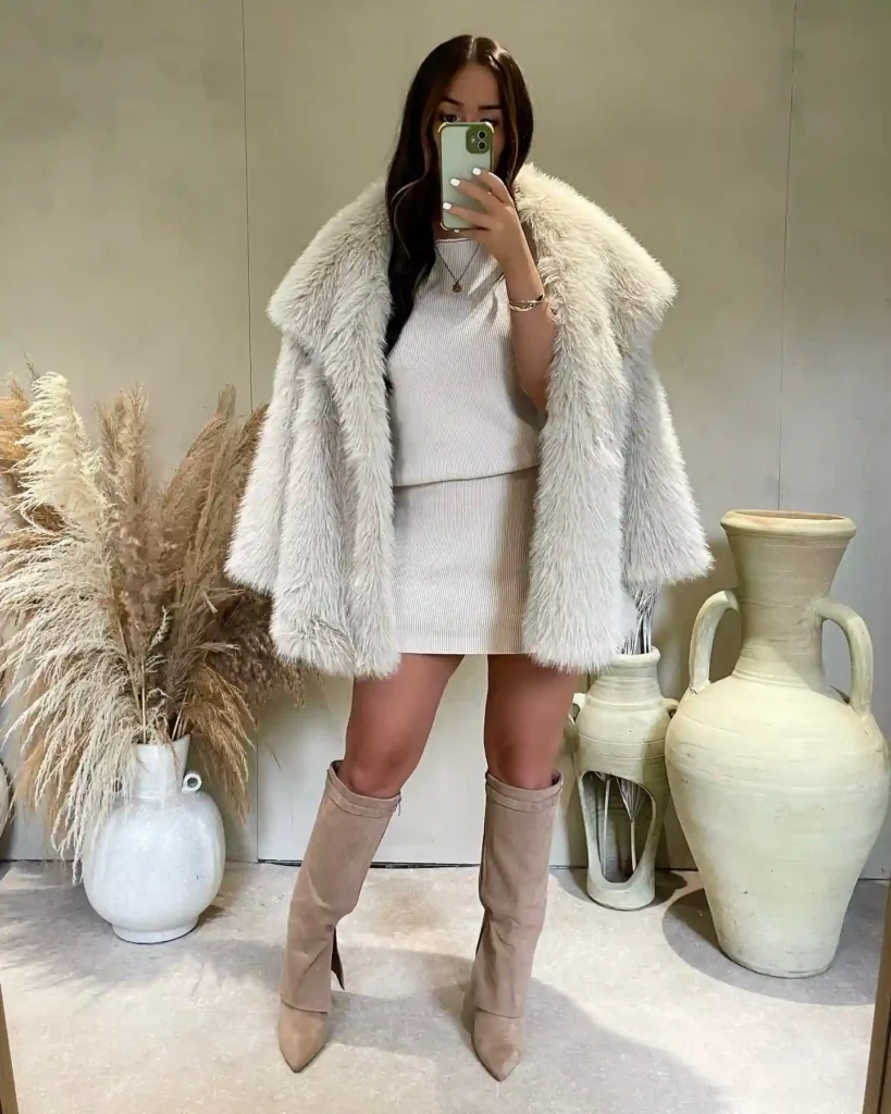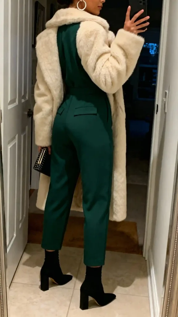 For an effortlessly chic look, try a fitted jumpsuit paired with a plush faux fur or teddy coat. It’s an easy one-piece outfit that feels both classy and comfortable. Add heeled boots, a clutch, and statement earrings to bring the outfit together.