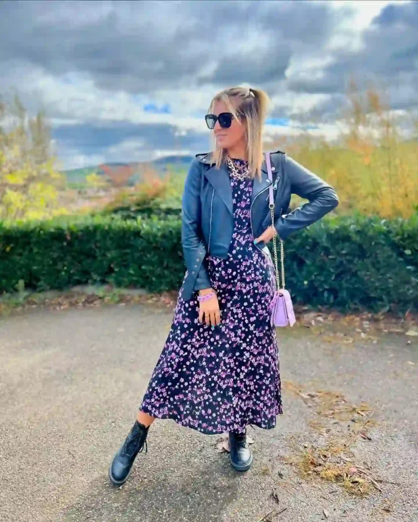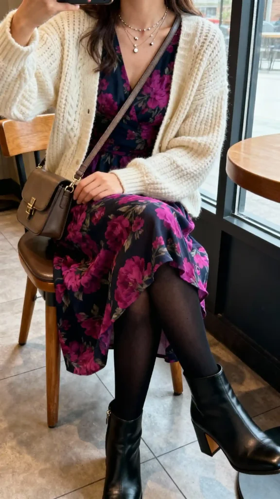 Don’t shy away from florals in winter. A floral midi dress in deep tones paired with a chunky cardigan creates a soft, romantic look. Add ankle boots, tights for warmth, and delicate jewelry to complete the outfit.