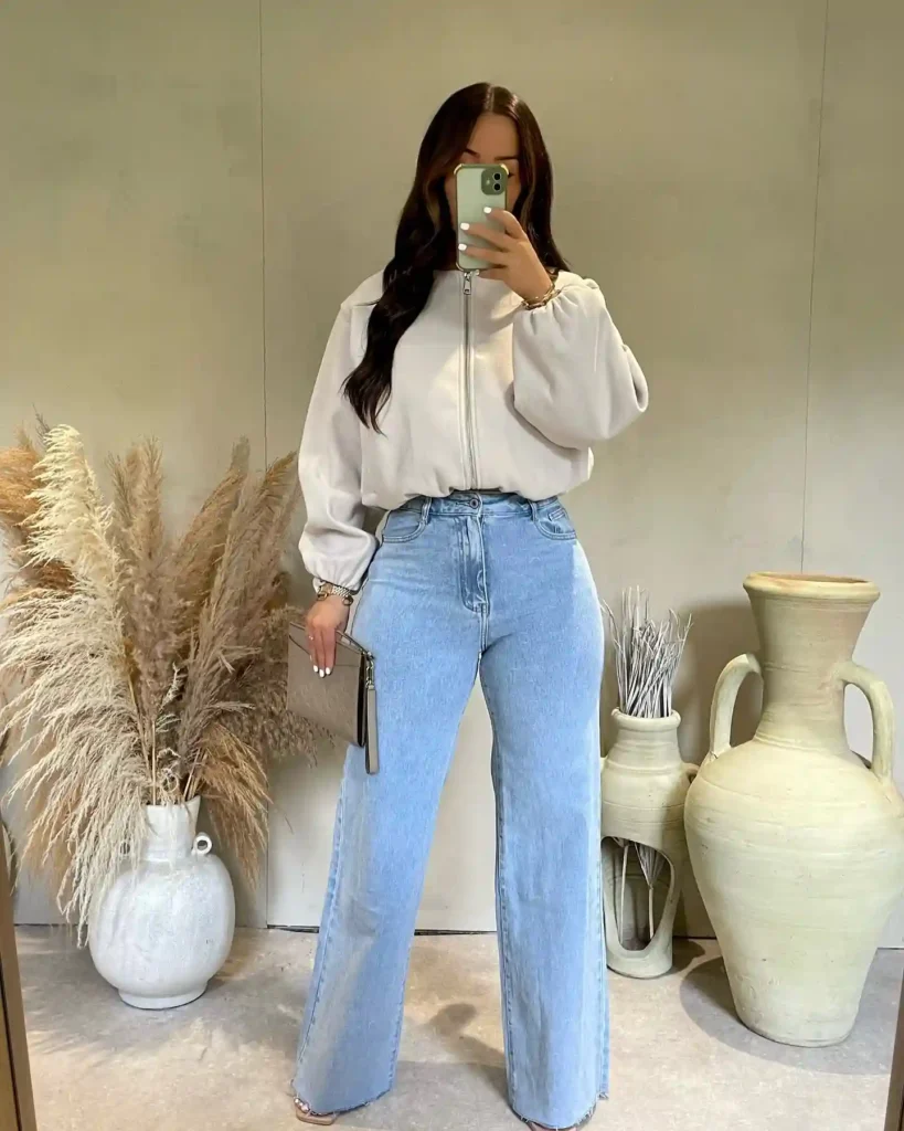 This outfit choice is effortlessly stylish and cozy. Pairing denim with a sweatshirt gives you that casual yet polished vibe that works perfectly for a baby shower. It’s an easy go-to look when you want to stay comfortable but still look put together.