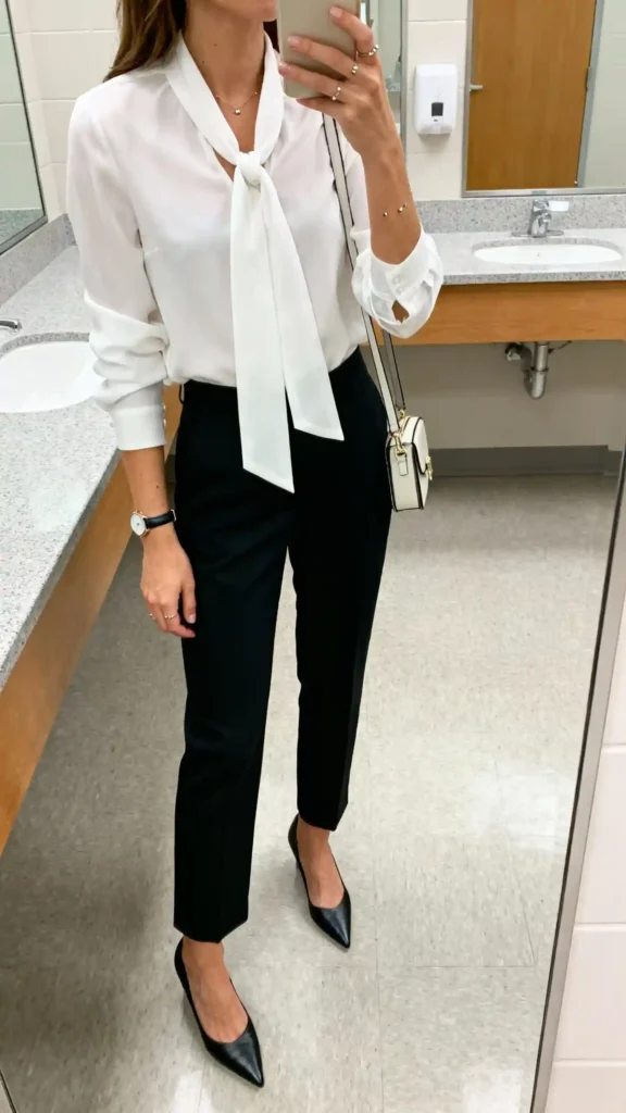 If dresses aren’t your style, tailored trousers with a standout blouse are a chic option. Pick satin, lace, or puff sleeve details to make it feel festive. Choose neutral or jewel-toned trousers and tuck in your blouse for a clean look. Pair with heels or loafers, add a slim belt, and finish with delicate jewelry.