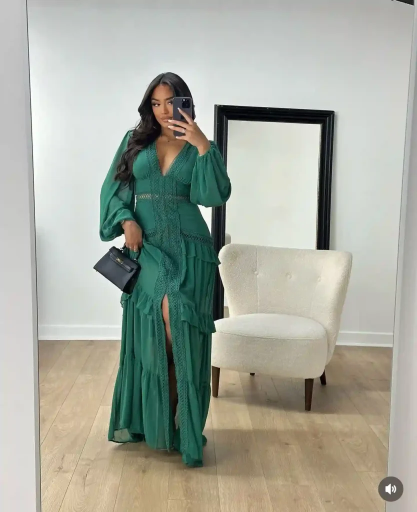 This green maxi dress fits beautifully with any baby shower theme. The lacy texture adds a soft and graceful touch that makes you stand out while staying elegant and feminine.