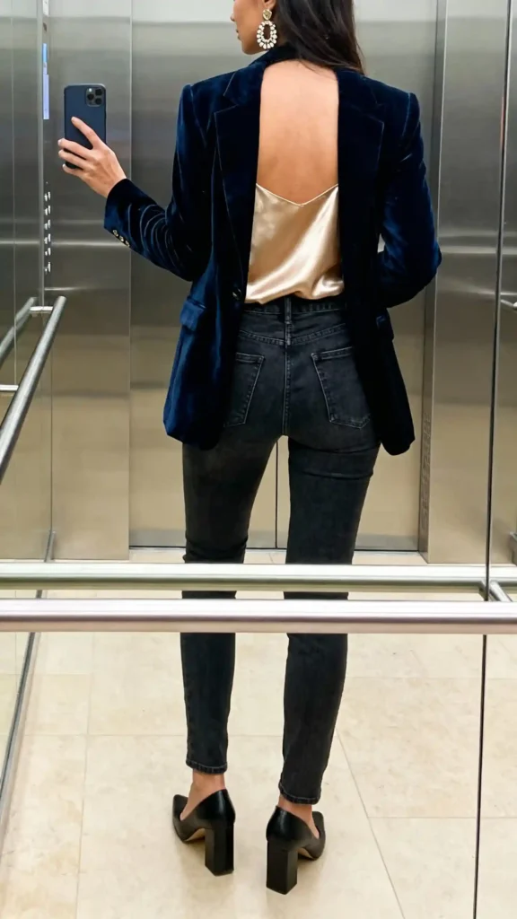 A velvet blazer worn with dark jeans is a stylish way to mix dressy and casual. Choose rich colors like emerald, navy, or burgundy for the blazer and pair with a silky blouse underneath. Keep your denim clean and dark for a refined look. Add heels, a clutch, and simple accessories to tie it all together.