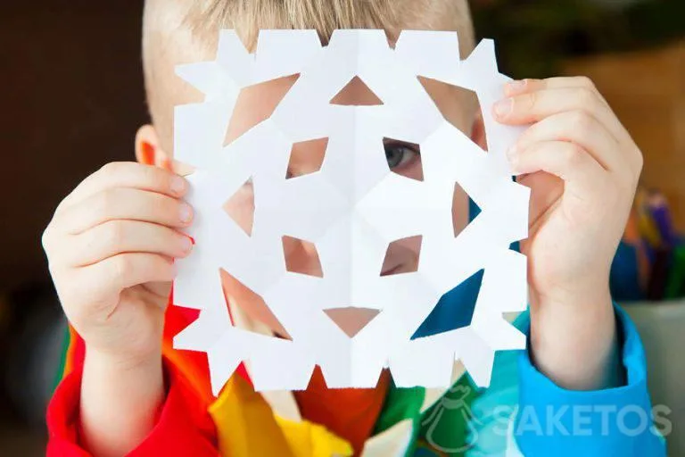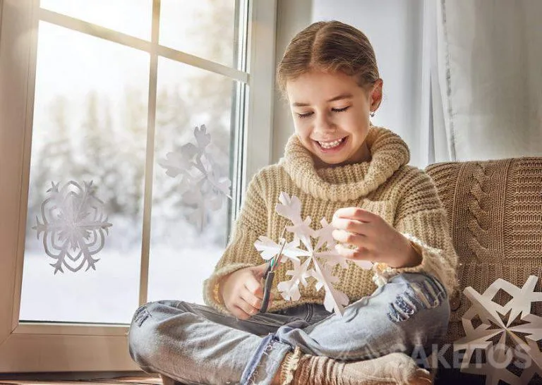 Paper snowflakes are such a sweet and timeless winter craft that instantly adds charm to your nursery. Just like in the image, your little one can sit by the window, cutting and smiling while creating their own snowflakes.