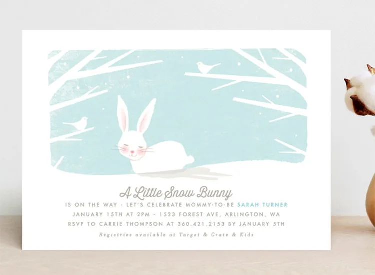 Bring a sweet, storybook touch to your baby shower with little snow bunny-themed invitations. Soft blue, blush, or lavender designs paired with delicate snowflake details make them perfect for a winter wonderland baby shower that feels soft and whimsical.