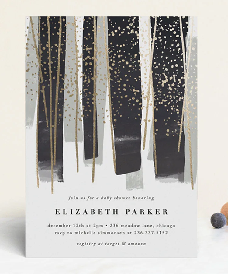 Want something a little unexpected? Gilded streamer invitations combine modern elegance with winter charm. The flowing design hints at snowy woods and shimmering frost without being too literal. They’re simple, artistic, and ideal for a chic winter celebration.