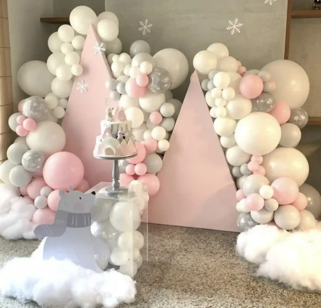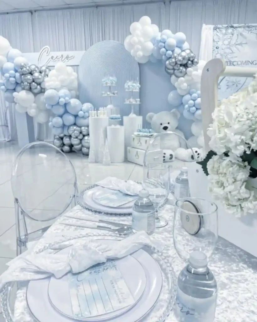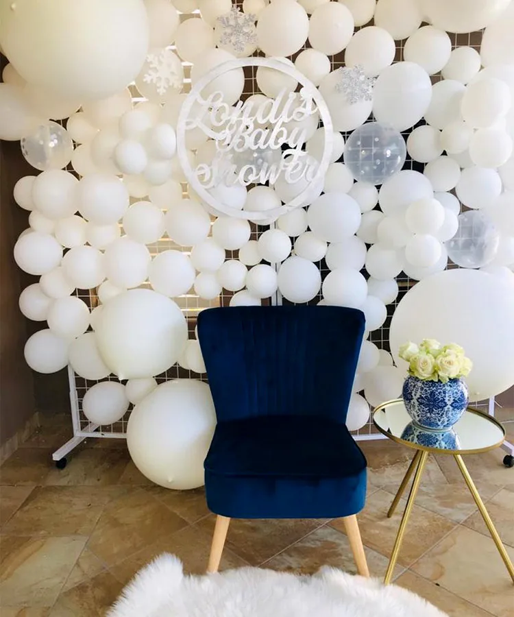 If you’re short on space, go with a balloon garland instead. Drape it along a dessert table or archway for the same wintry impact without taking up too much room. Choose colors like pearl white, icy blue, and metallic silver to keep the look soft and elegant.