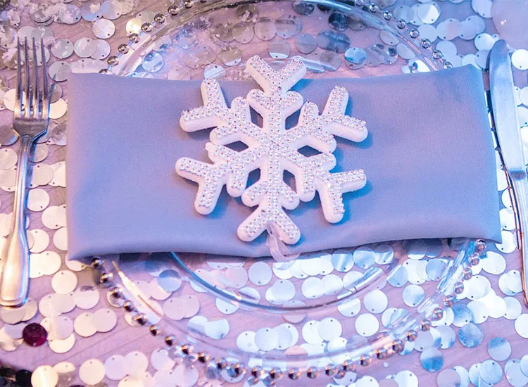 Don’t forget the tables. Add silver confetti circles or snowflake sprinkles for a subtle shimmer that catches the light. Use white plates, crystal glasses, and candles to create a frosty glow. For a sweet touch, place a snowflake cookie at each seat as a party favor.