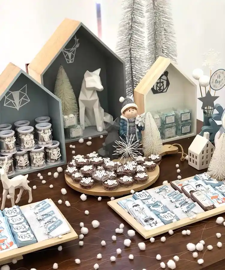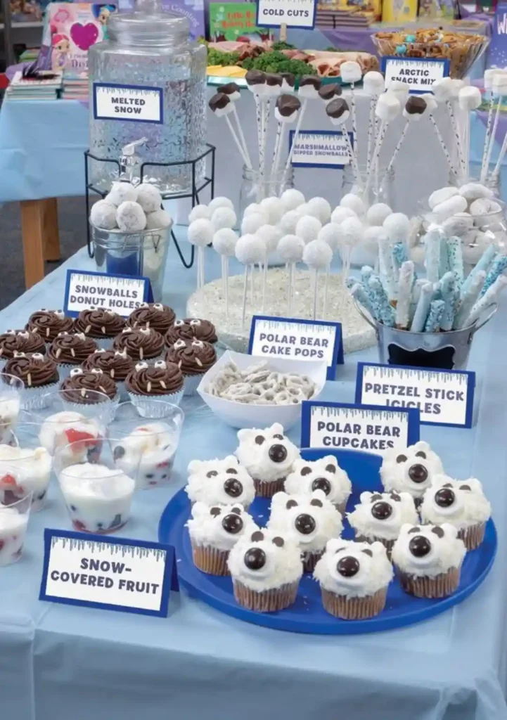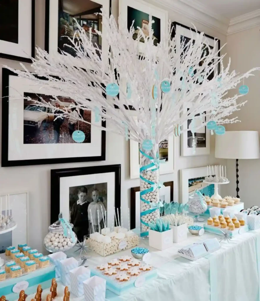 This stunning dessert table captures the heart of a winter wonderland theme perfectly. Frosted branches, icy blue ribbons, and sweet treats in every shade of white make this setup a dream come true. From snowflake cookies to fluffy marshmallow pops, everything feels festive, elegant, and full of winter sparkle.