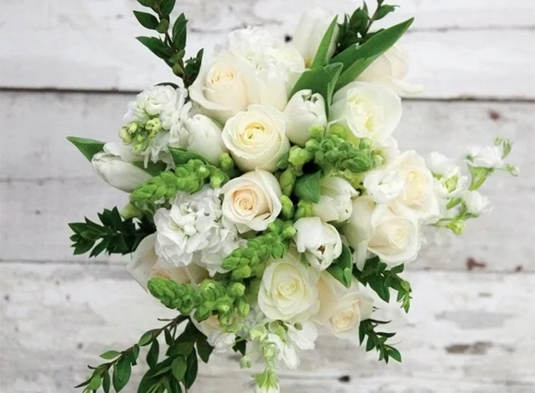 Add a touch of freshness with white and green florals. Use white roses, hydrangeas, or tulips paired with greenery like eucalyptus or pine. The soft mix feels natural and adds warmth to the winter palette. It’s perfect if you want a blend of rustic charm and winter elegance.