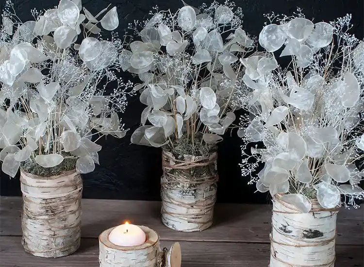 For a budget-friendly and long-lasting option, go for dried flowers. Combine baby’s breath, lunaria, or cotton stems in birch bark or neutral containers. These arrangements have a beautiful, organic look and can double as take-home gifts for guests.