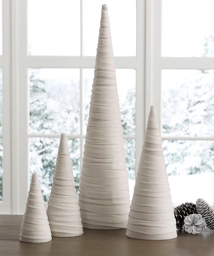 Add a modern twist with velvet tree cones in shades of ivory, gray, or soft green. Arrange them in clusters along your table to mimic a winter forest. Their texture adds warmth while keeping the look minimal and chic, perfect for a contemporary take on a winter wonderland shower.
