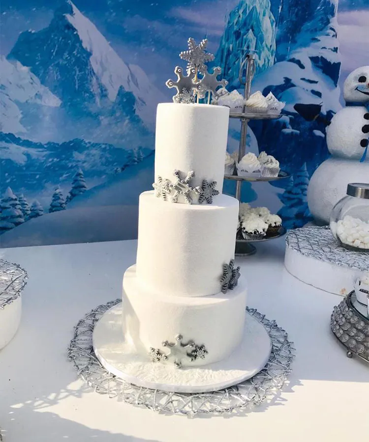 A tall white cake with delicate snowflake decorations is a true showstopper. Add silver or pearl accents to make the design sparkle under soft lighting. It’s a simple yet stunning choice that perfectly captures the clean, crisp beauty of winter.