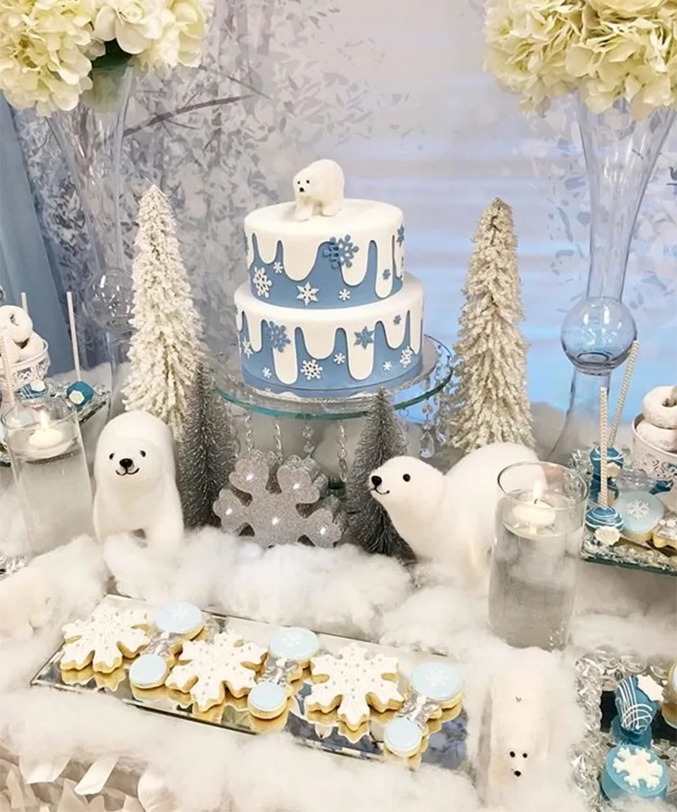 Bring a touch of fun to your dessert table with a polar bear-themed cake. Layer shades of icy blue and white, and top it with an adorable fondant bear surrounded by snowflakes. It’s cute, creative, and guaranteed to make guests smile.