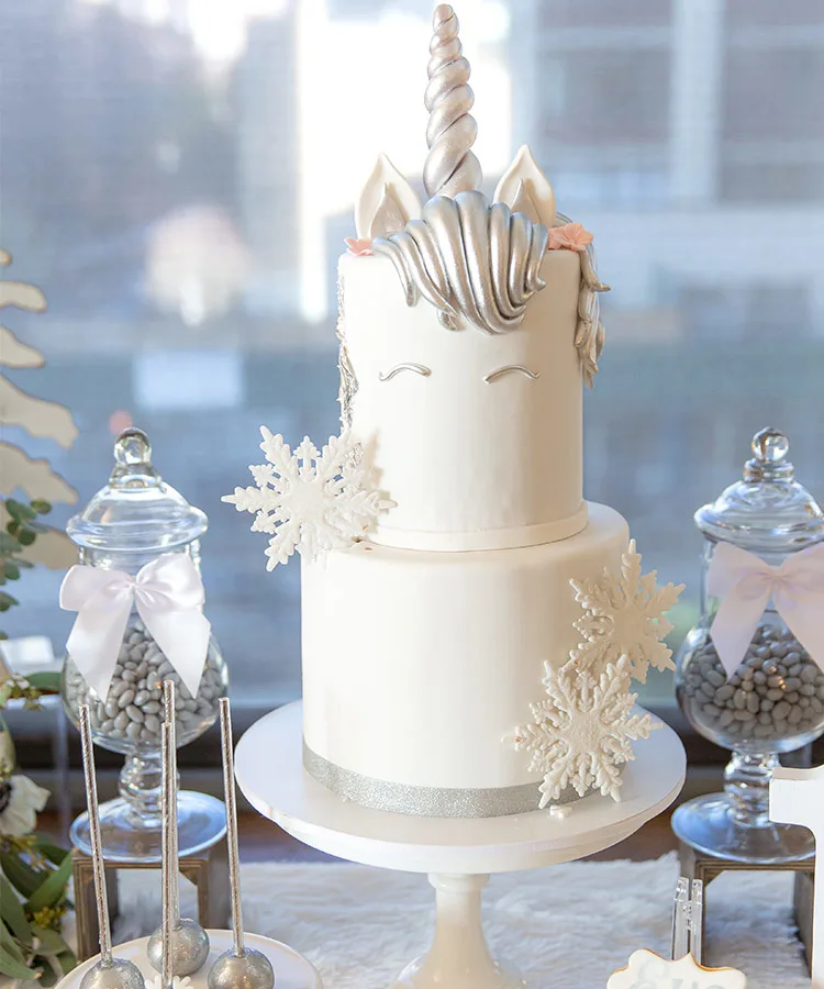 Add a bit of whimsy with a winter unicorn cake. Choose a pure white base with a shimmering silver mane and tiny snowflake accents. This magical design combines elegance with playfulness, making it perfect for a baby shower that feels dreamy and enchanting.