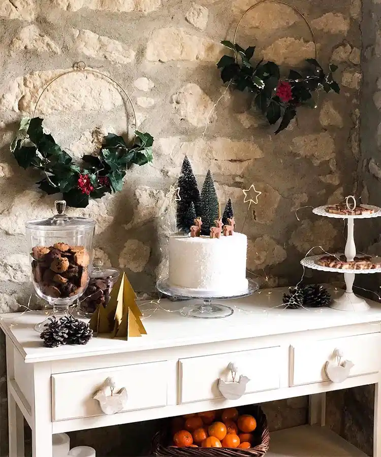 For a cozy winter twist, mix rustic details with your sparkling decor. Add mini pine trees, snowflake garlands, or small carved woodland animals to your tables. White bottle brush trees also look adorable and add a nostalgic winter vibe. The combination of natural textures and sparkle feels inviting and balanced.