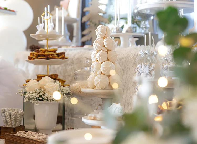 For something unexpected, go for a macaron tower instead of a traditional cake. Stack delicate white or pastel macarons in a cone shape to create a frosty, elegant display. It’s just as impressive as a layered cake and offers guests a bite-sized treat that melts like snowflakes.