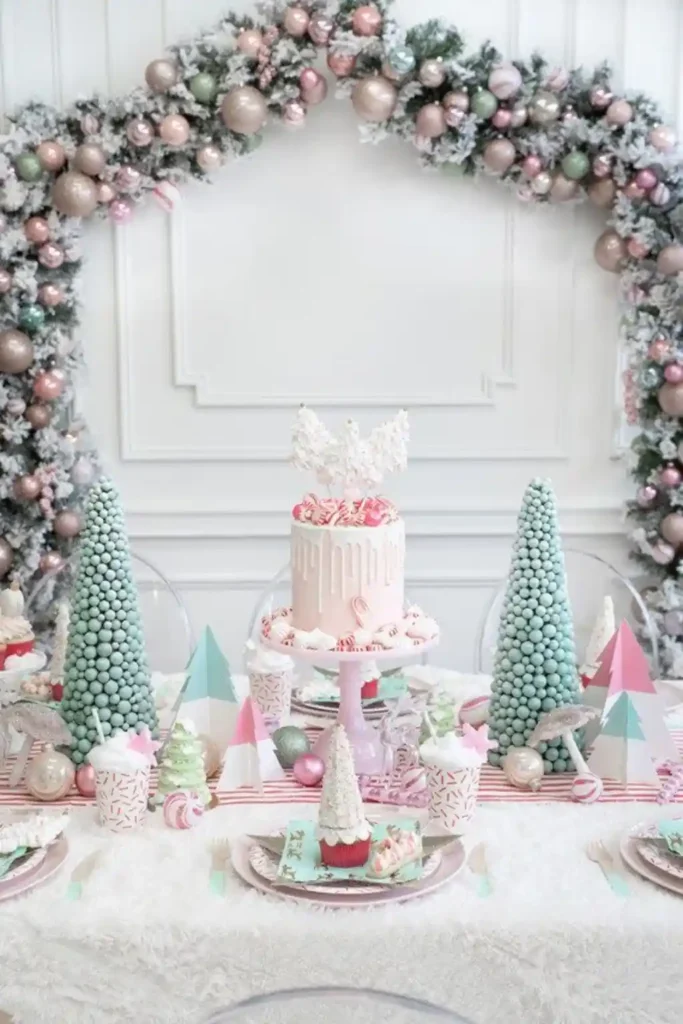 For a playful twist, add pops of pastel pink, mint, and white to your winter wonderland table. The frosted garland, candy-colored trees, and peppermint treats make this setup sweet and cheerful. It’s perfect for moms who love a bright, whimsical take on the classic winter look.