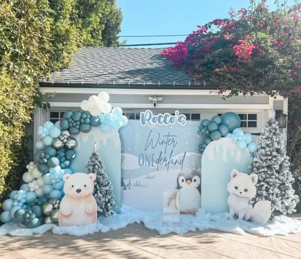 Transform your space into an arctic dream with this outdoor winter wonderland setup. Fluffy faux snow, balloon arches, and adorable polar bear and penguin cutouts bring the scene to life. It’s a cozy yet refreshing way to celebrate, especially if you want that magical snowy backdrop vibe.