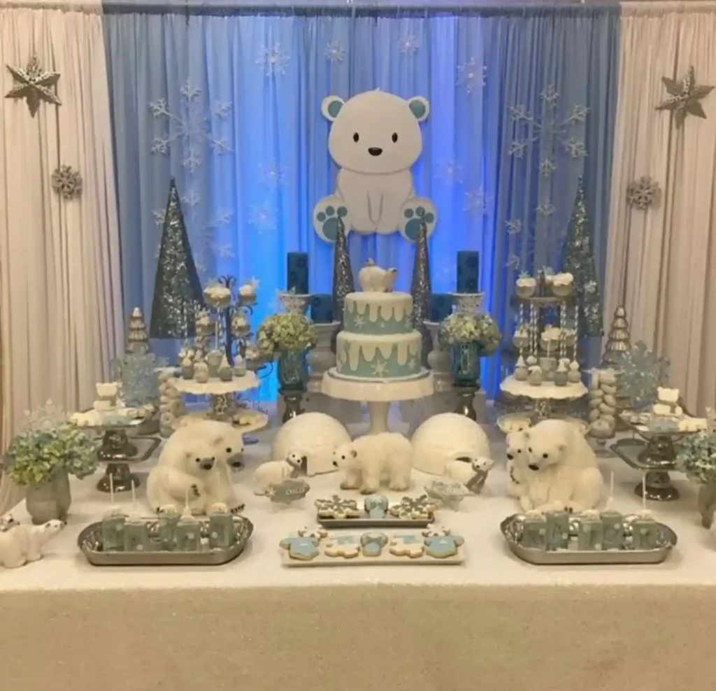 This adorable dessert table filled with polar bears, snowflakes, and shimmering trees is pure winter perfection. The layered cake with icy blue frosting stands tall at the center, surrounded by cookies, cupcakes, and snowy accents that feel straight out of a fairytale. It’s a beautiful mix of playful and elegant.