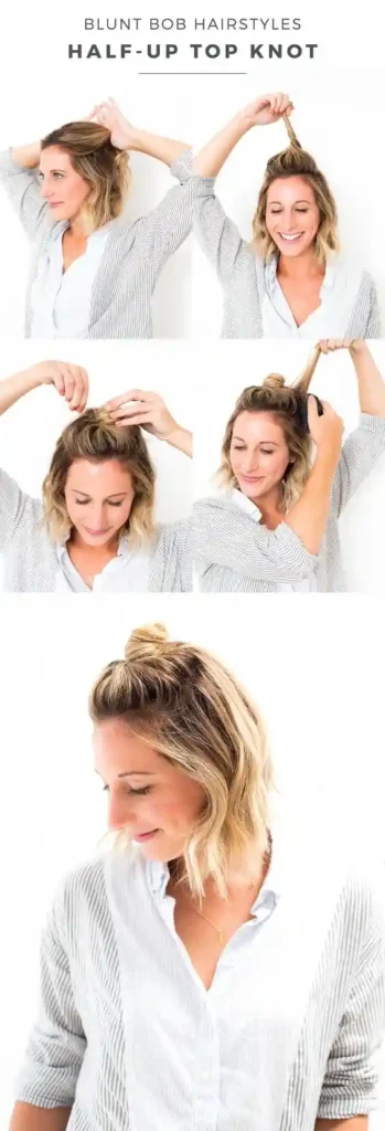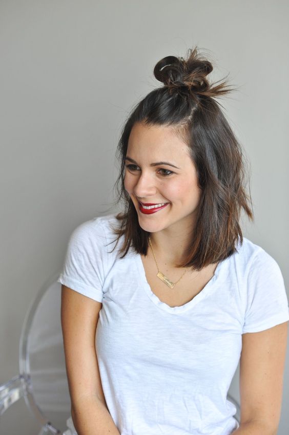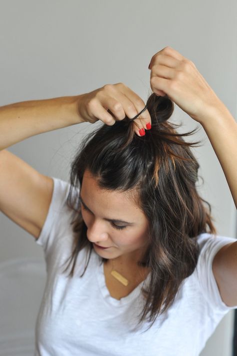 This super versatile style works for almost any hair length. Take the top section of your hair, pull it up into a small bun or knot at the crown, and secure it.